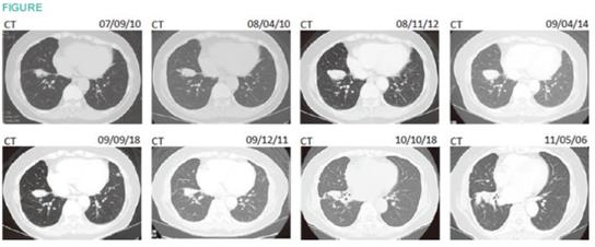 68岁女性,诊断时胸膜播种、对策纵隔淋巴结转移,cT4N3M0、Stage IIIb期肺癌。经小半年CBDCA+PTX联合化疗治疗后停止化疗,1次αβT细胞治疗后仍然进展,改用γδT细胞多次治疗后维持了3年以上。
