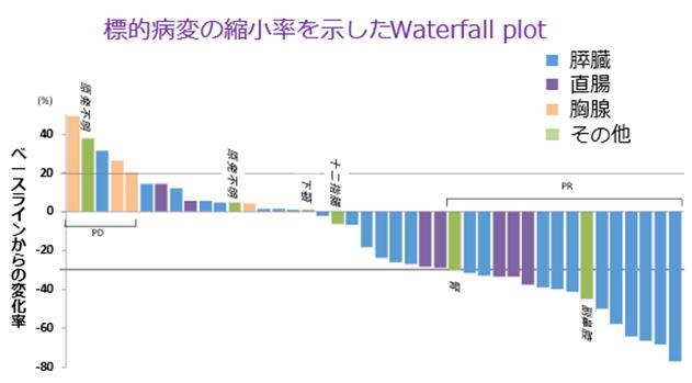 对在国立癌症研究中心接受PRRT治疗的42例患者的疗效总结显示,总缓解率为38.1%。其中胰腺原发灶44.0%,直肠原发灶42.9%。包括肿瘤未增殖的病例在内,肿瘤稳定效果总体为90.5%,胰腺为96.0%,直肠为100%,胸腺为50%(图3)。有11例患者因肿瘤生长或贫血等副作用而停止治疗。