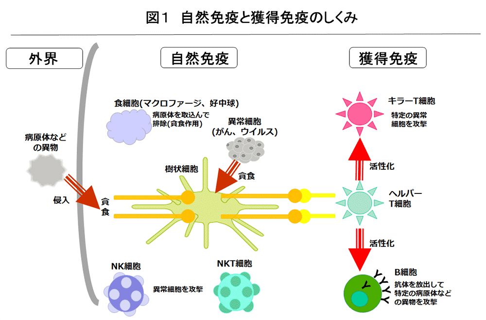 当病原体侵入人体时,首先起作用的是“自然免疫”。它反应迅速,对入侵的病原体发动攻击。当这种自然免疫,即先天性免疫攻击并消灭病原体后,会将有关病原体的信息传递给“获得性免疫”。获得性免疫会成立一个专门对抗病原体的单位,并产生强大的抗体来攻击它。然后,它会记住曾经入侵过的病原体的信息。当病原体再次尝试进入体内时,免疫系统可以迅速将其消灭。