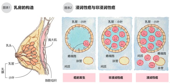 小叶和乳管细胞异常病变增殖后乳腺癌就发生了。癌细胞局限于小叶或乳管上皮细胞内的为“非浸润性癌”,癌细胞扩散到小叶或乳管外的为“浸润性癌”(图2)。非浸润性癌不威胁生命,浸润性癌的微小癌细胞可能扩散到身体其他部位,需进行全身治疗。