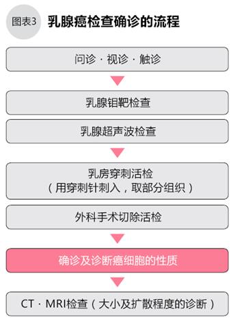 经过视诊、触诊、钼靶、超声波等影像检查,最后通过显微镜下观察癌变组织的病理诊断才能确诊乳腺癌。当怀疑乳腺癌时,请先通过问诊、视诊、触诊、钼靶、超声波检查确认是否存在病变或肿块。医师诊断时要先观察乳房,查看乳头是否有分泌物,乳房皮肤上是否有湿疹,触摸确认肿块的位置,大小和硬度,颈下和腋下淋巴结有无肿大等(图3)。