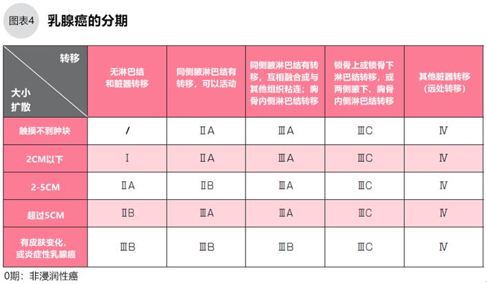 分期(Stage)是了解患者病情、预后和选择治疗方法的重要指标。根据肿瘤大小、周围淋巴结和脏器转移情况,将乳腺癌分为0、Ⅰ、ⅡA、ⅡB、ⅢA、ⅢB、ⅢC、Ⅳ期的8个阶段。0期是非浸润性癌,Ⅰ期以后是浸润性癌,越靠近Ⅳ期就越接近晚期(图4)。