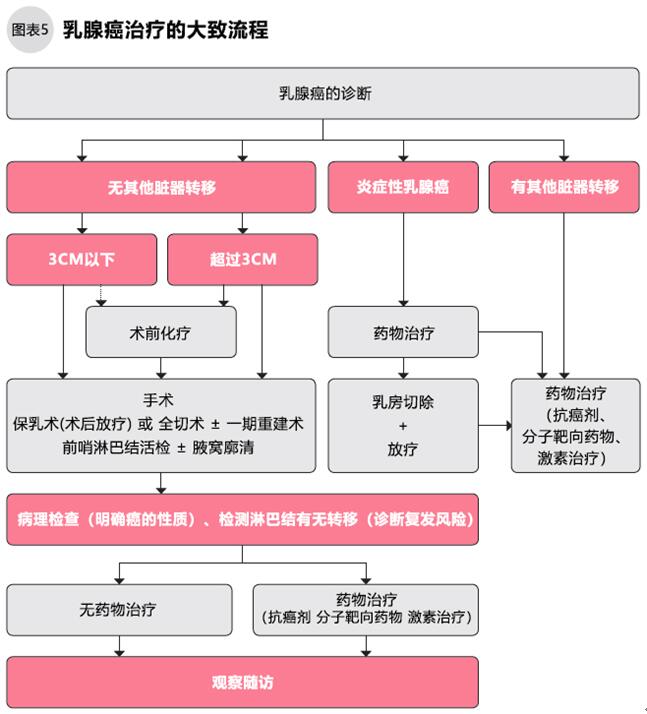 选择什么样的治疗方法,要综合考虑病理诊断的肿瘤性质、分期、患者的身体状态(是否闭经、脏器功能是否良好)以及患者本人的意愿。比如患者是炎症性乳腺癌,乳房红肿并伴有脏器转移,那么最初应该选择全身性的药物治疗,而不是手术。后文详述根据乳腺癌的性质指标选择用药。患者在选择治疗方法前应在医师处先询问清楚病理诊断结果、影像诊断结果、分期和肿瘤的性质。有多种治疗选择时,先明确治疗的目的、治疗内容、风险、获益、治疗所需时间和费用等,根据医师的建议选择患者认同的治疗方法。