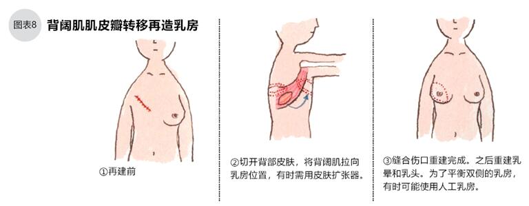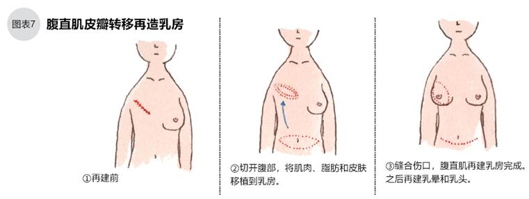 乳房再建术的填充材料,可使用自体组织,也可使用人工乳房。用自体组织的有三种移植方法:“皮瓣再建术”移植腹部肌肉、脂肪和皮肤(图7);“穿通支皮瓣再建术”移植腹部、臀部富含血管的脂肪、皮肤组织;“背肌皮瓣再建术”移植背部肌肉等。其中传统支皮瓣再建术不移植肌肉组织,患者伤痛较小,但是这个手术非常难,只有极个别医院可以完成。