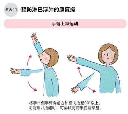 腋下淋巴廓清术可能使淋巴液从淋巴管中泄露,造成肩关节活动障碍。为了预防淋巴浮肿,术后在淋巴液引流期间可做用手握橡皮球的练习;经常活动每根手指;拔掉引流管后练习上举手臂;活动肩关节等康复运动,1天3次,坚持3个月(如图11)。