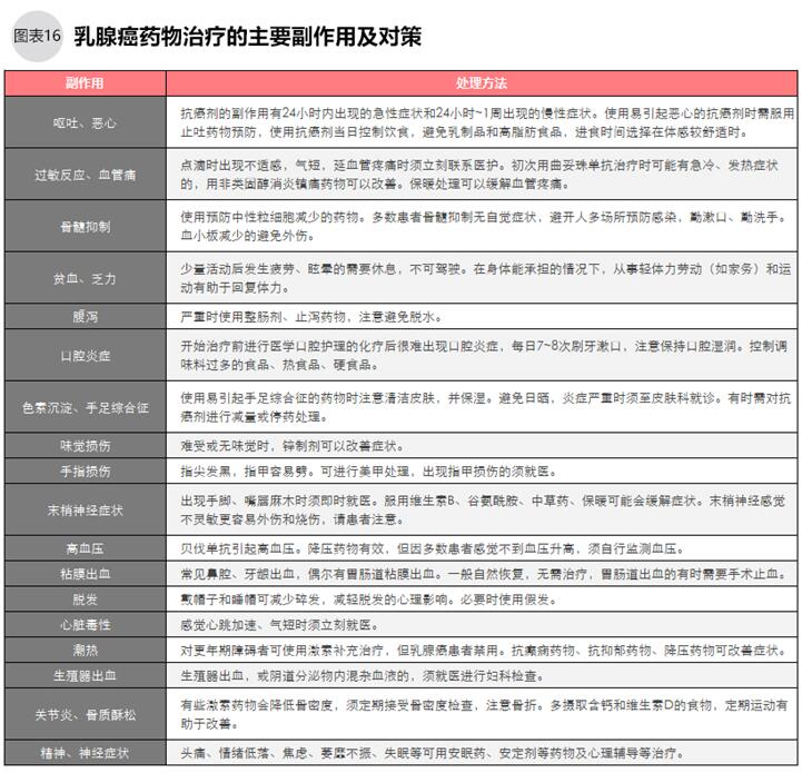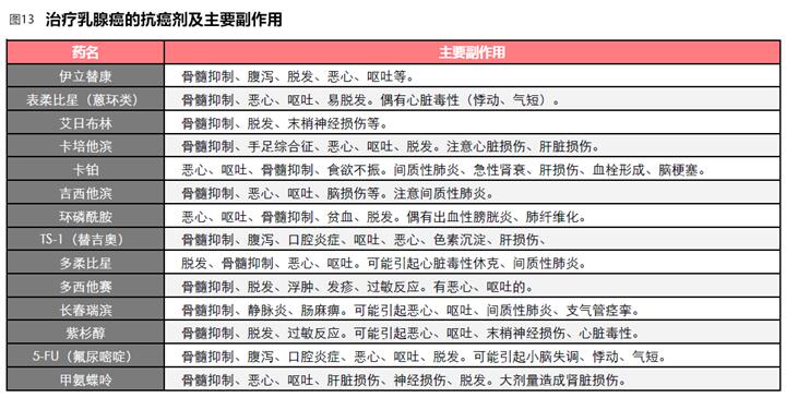 副作用分为可自行处理的与需就医处理的,有自觉症状和初期无症状但在医疗机构检查后诊断出的。多数用于乳腺癌治疗的抗癌剂副作用是骨髓抑制(血小板、白细胞、红细胞、中性粒细胞减少)。表柔比星、环磷酰胺、多柔比星等易引起强烈的恶心、呕吐,在这些药物点滴的同时加入止吐药物,口服血清素抗体抗结剂和类固醇药物可缓解症状。
