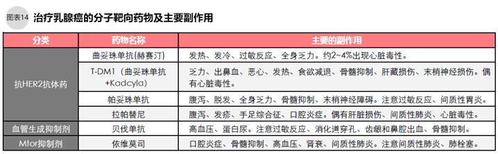 分子靶向药物的副作用没有抗癌剂引起的骨髓抑制、脱发等那么严重,抗HER2抗体药物曲妥珠单抗、帕妥珠单抗、TMD-1等偶尔发生心脏毒性(心功能损伤、心衰),出现这些副作用时应停止用药。贝伐单抗可能引起高血压、蛋白尿、鼻齿出血、骨髓抑制。