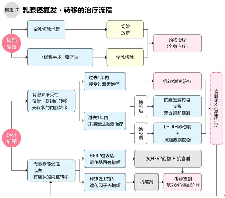 有激素感受性的人复发转移后,原则上使用抗雌激素药物、LH-RH抗结剂、芳香酶抑制剂等单药或联合治疗。有激素感受性并HER2阳性的,除了激素治疗,也可以用抗HER2药物和激素治疗配合,或者激素治疗+抗HER2药+抗癌剂治疗(图17)。