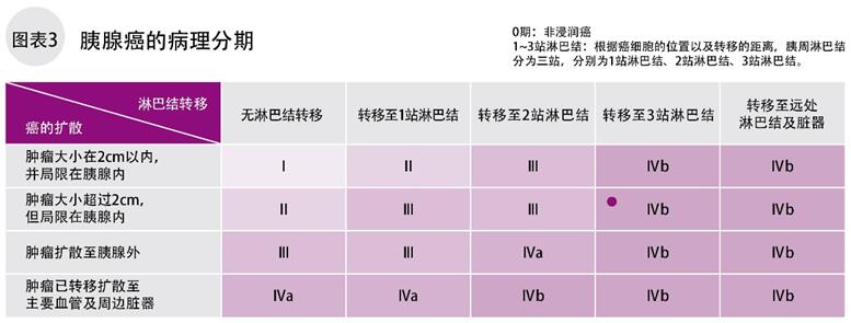 分期表示肿瘤的进展程度,同时也是制定治疗方针的重要指标。胰腺癌的分期根据肿瘤的大小、扩散程度、淋巴结和血管及其他脏器转移有无转移,可以分为0、Ⅰ、Ⅱ、Ⅲ、Ⅳa、Ⅳb期的6个阶段,数字越大约接近晚期(图3)。