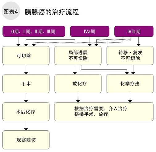 0、Ⅰ、Ⅱ、Ⅲ、Ⅳa期的胰腺癌,如果可手术切除,切除后身体中仍然可能残留微小的癌细胞,可以用化疗尽量清除它们,这是胰腺癌最基本的标准治疗方法。胰腺癌容易向周围淋巴结和脏器发生转移,即使病灶很小,手术后的化疗也是必不可少的(图4)。