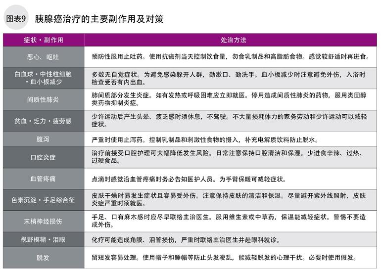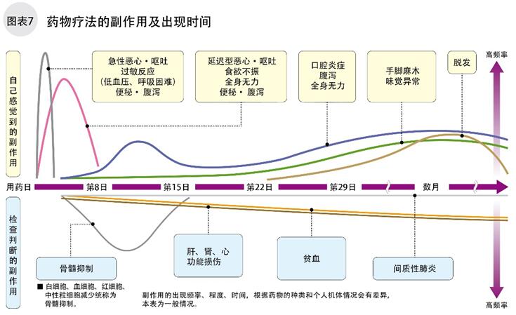 图7总结了药物疗法的副作用类型,症状的强弱和出现时间。随着药物开发,现在对化疗药物的副作用已经能控制,不至于产生严重的后果,请不要因为恐惧而中断化疗。