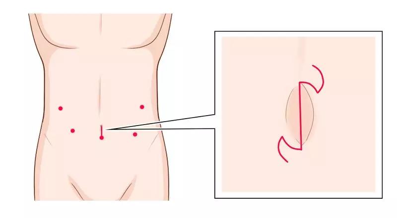 在腹腔镜手术和机器人手术中,仅在多个位置有约5至12mm的小孔,瘢痕尽可能不显眼。另外,为了取出切除的胃,脐带附近的孔延伸至约3cm长。在我们中心使用肚脐形状的隐藏伤口,采取一种称为“锯齿形解剖”的方法,并将剔除胃的疤痕切成Z形。通过这种方式,疤痕将适合肚脐,变得不那么明显。