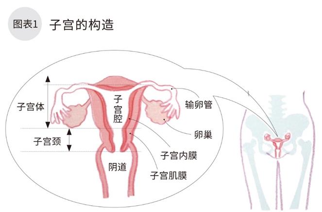 子宫主要由肌肉组成,分两个部分,靠近子宫入口的宫颈部和深处的子宫体。非妊娠期的子宫大小约比鸡蛋稍大一点。