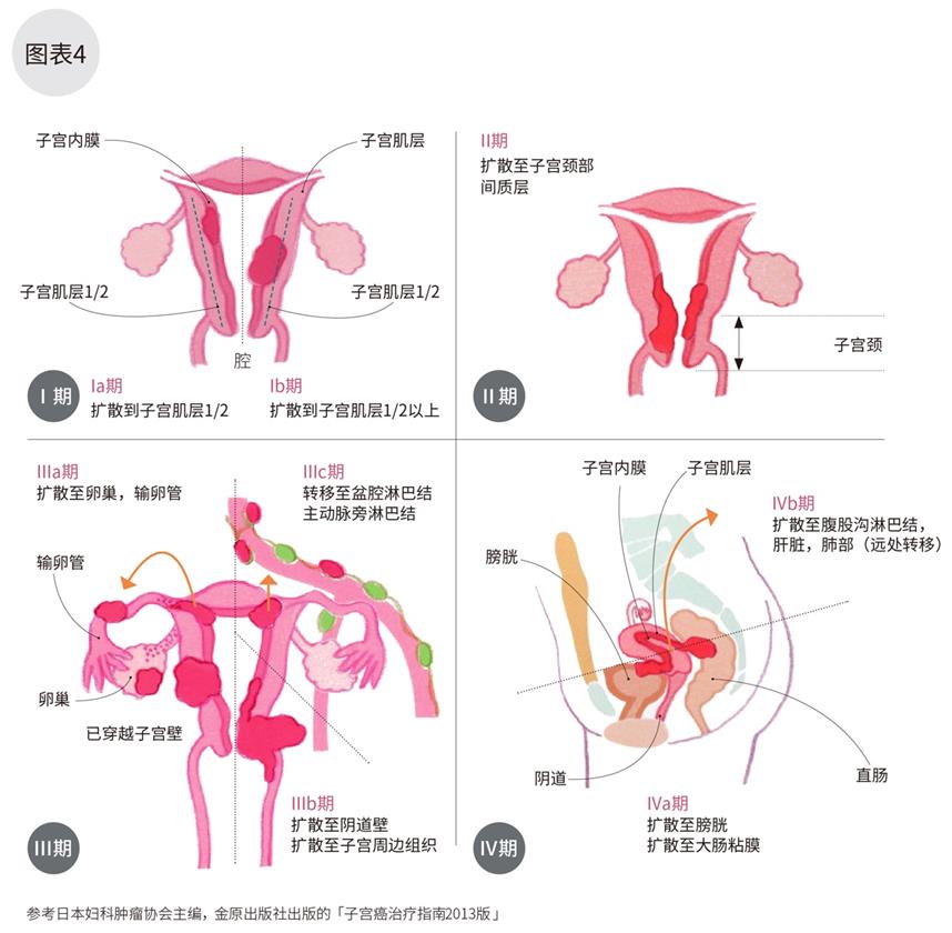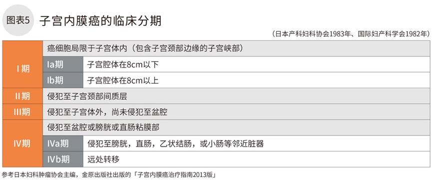 为了制定治疗方针,评估癌细胞的浸润范围的判断标准即为分期。日本妇产科学会制定了《临床分期》(图5)和《术后病理分期》(图6)2种分类的标准。该标准基于2008年改版的国际妇产科联合会(FIGO)的分类标准,并于2011年再次改版而成。