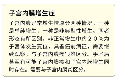 子宫内膜异常增生增厚,分两种情况。一种是单纯增生,一种是非典型性增生。两者形态有所区别。非正常增生中约20%为子宫体发生异位,具备癌前病征,需要继续观察,与子宫内膜癌很难区分。手术后甚至可以发现子宫内膜癌和子宫内膜增生同时存在。也需要与子宫内膜炎区分。