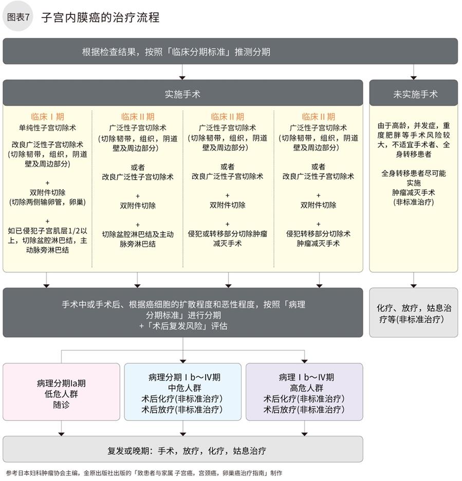 如上所述,无论临床分期如何,子宫癌的第一治疗方案是手术。由于高龄或基础疾病无法手术的,或者术后评估为中高风险复发的,可以单独实施药物治疗(化疗)或放疗,或者放化疗联合。有妊娠,生育要求的患者,可以选择黄体酮的内分泌治疗。