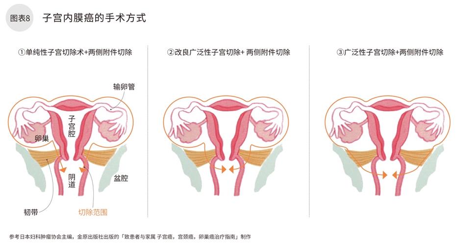 尚可不必实施“广泛性子宫全切术”(将子宫韧带及周边组织从盆腔结合处切断,阴道壁,阴道周边组织切除)。(图表8-2)。可行“全子宫切除术”和“广泛性子宫全切术”中间的“次广泛子宫切除术”。
