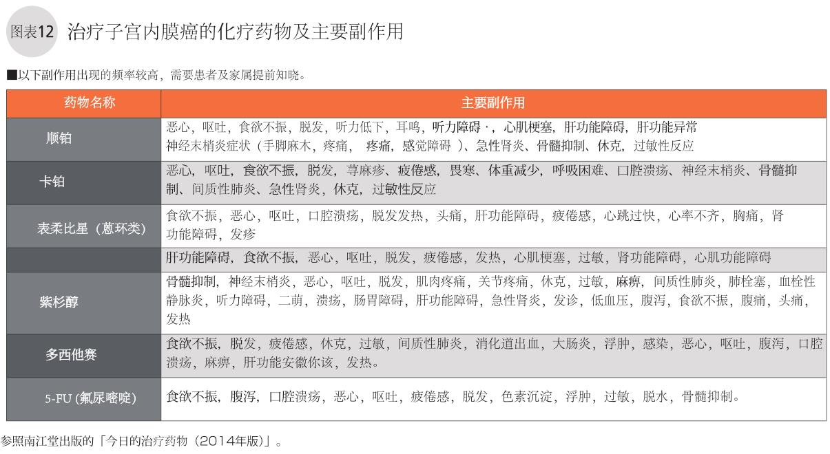 子宫癌的药物治疗有化疗和内分泌治疗两种方式。乳腺癌等一部分癌症有阻碍特异抗原的靶向药,但子宫癌暂时还没有靶向药可以用来治疗。下面我们来细说下化疗的副作用。