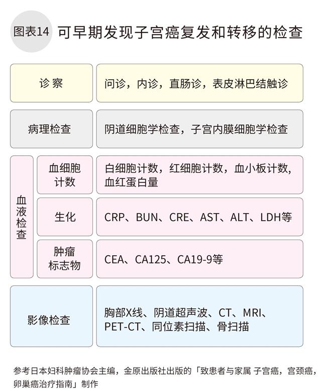 手术,放疗后可通过影像检查,肿瘤标志物测定来判断癌细胞是否消失,或者变少。但是即使肉眼或检查数据显示癌细胞消失,手术切除的子宫,卵巢,输卵管附近脏器或腹腔,以及离原发部分较远脏器还是可能会出现复发或转移。通常复发发生在2年内,5年以后也可能会发生。所以至少5年中需要定期随访。前三年每1~3个月,第四~五年每6个月,六年以后1年1次。随访期间,需进行问诊,内诊,直肠检查,阴道细胞学检查,影像检查,血液检查等。(图表14)。这些检查与确诊子宫癌时的检查相同。