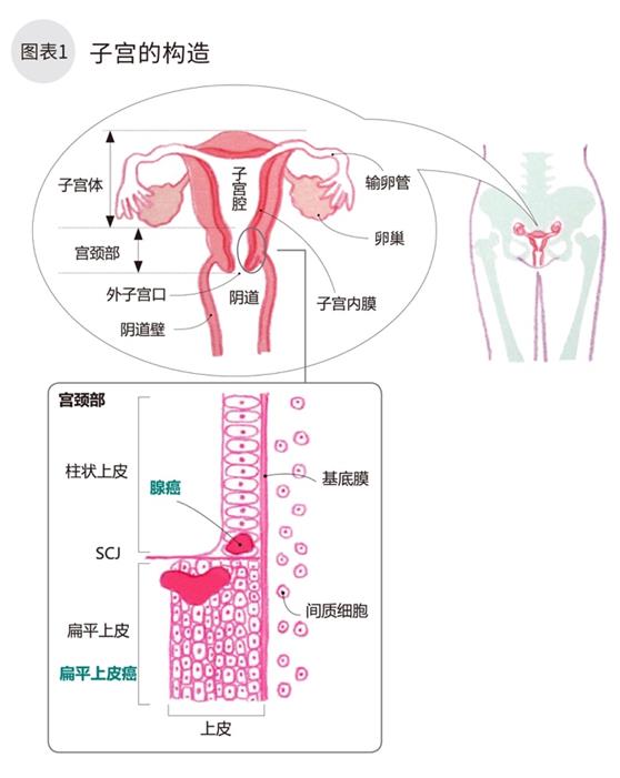 子宫整体呈中空梨型,分为附着胎盘的类圆形上半部分,和连接阴道的细长形下半部分(图表1)。宫颈癌发生在子宫口到宫颈部位。主要分两种,发生在宫颈部表面扁平上皮细胞的扁平上皮癌,和发生在柱状上皮细胞的腺癌。约80%为扁平上皮癌(图表2)。