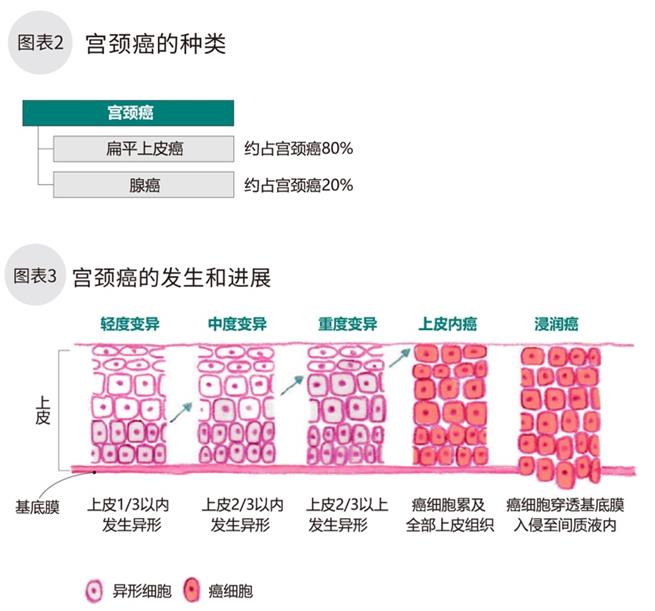 宫颈部,由表面上皮细胞(扁平上皮细胞,腺细胞)和内侧的基质细胞构成,中间由基底膜隔开。宫颈癌病变发生在上皮细胞中,暂时停留在上皮内。但会随着破坏基底膜而逐渐侵袭间质层(浸润癌)(图表1,3)。肿瘤逐渐增大,穿过宫颈部,向阴道壁,子宫附件,盆腔壁,膀胱,直肠等进展,继而向肺等远处器官转移(图表6)。