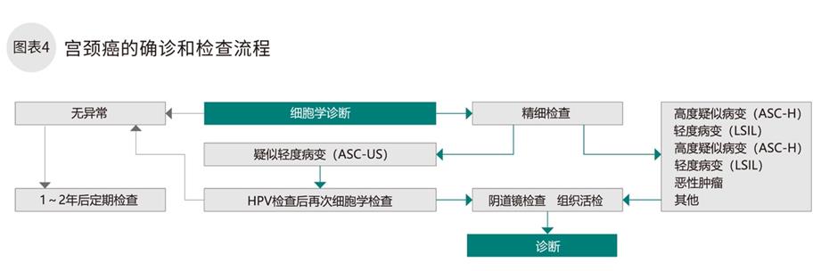 宫颈癌筛查中,用棉签或小刷子刮取宫颈部细胞进行细胞学诊断。如果疑似宫颈癌,将继续进行精密检查(图表4)。细胞学诊断依据Bethesda分级系统(图表5)。30岁以上需要细胞学诊断与HPV检测结合。30岁以下的,虽然HPV阳性几率较大,但一般可自行恢复,细胞学诊断有异常时再实施HPV检测即可。