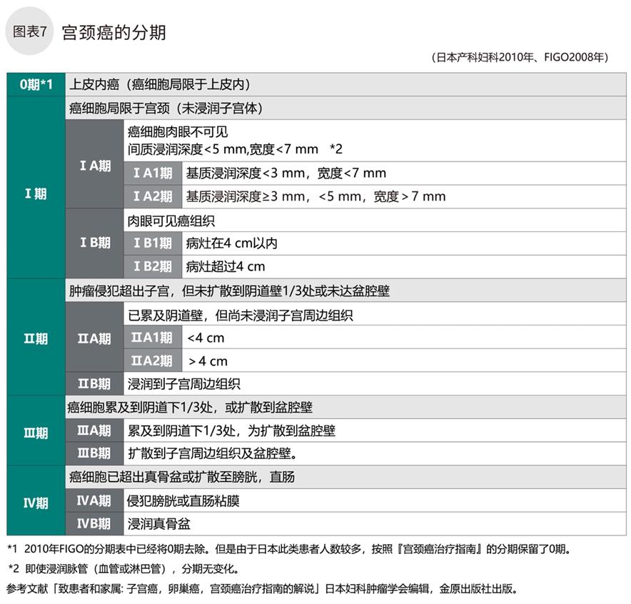 在日本诊断的宫颈癌中46%为上皮内癌(较早发现),所以在《新FIGO分类》中保留了0期分类。宫颈癌的分期与其他癌症不同,治疗前确定了分期后,治疗后将不再改变。