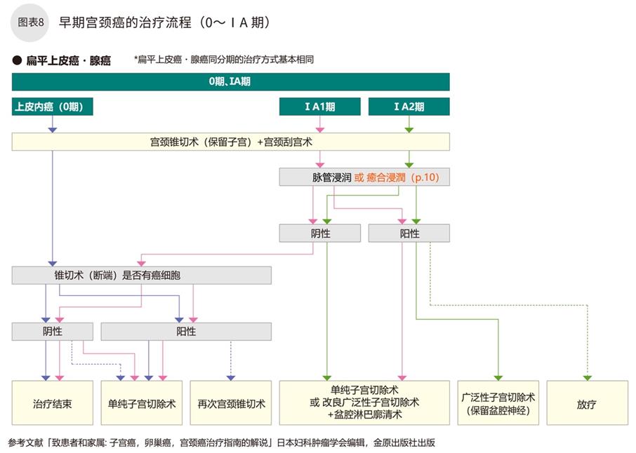 原则上,癌细胞扩散超过上皮细胞的ⅠA期就需要将子宫摘除。ⅠA1期实施全子宫切除术,只摘除子宫;ⅠA2期范围稍微扩大,实施改良广泛性子宫切除术和盆腔淋巴廓清术;但是ⅠA期患者中有生育需求的年轻患者较多,宫颈锥切术为ⅠA1期第一选择,ⅠA2期如符合条件也可考虑实施宫颈锥切术(图表8)。