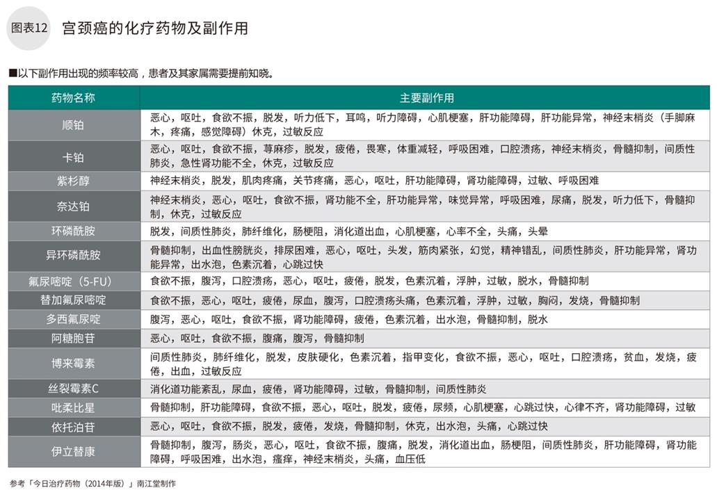 宫颈癌的化疗药物中,铂类的治疗效果最好,通常联用其他不同机理的化疗药物。现阶段,顺铂+紫杉醇的联用为标准治疗药物,卡铂+紫杉醇的联用也开始用于治疗。但是由于化疗药物对正常细胞也有影响,会出现各种副作用。尤其是对新陈代谢旺盛的细胞,如头发,口腔和消化器官的粘膜,骨髓等影响较大,容易引起脱发,口腔溃疡,腹泻,骨髓抑制等。适用于肝脏,肾脏,骨髓功能等没有大问题的患者。但如果副作用反应较大,可以考虑调整甚至停用药物。对于治疗产生的副作用和应对方法需要提前知晓并重视。