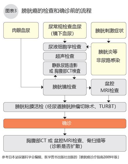 要确诊膀胱癌,需要进行病理诊断。即局部(下半身)麻醉,通过内视镜切除部分膀胱病变的粘膜进行活检。通常早期膀胱癌的治疗方法为经尿路膀胱肿瘤切除术。如果是浅表性癌,或尿路上皮癌,通过膀胱粘膜活检即可进行治疗(图表3)。浸润性癌则需要进一步进行胸腹部CT检查,骨扫描等确认淋巴或其他器官是否发生转移。通常,经过胸腹部CT检查后才实施膀胱粘活检。