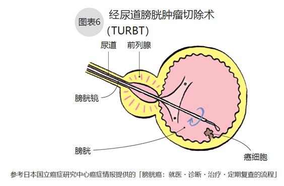 初诊为膀胱癌的患者首先要接受微创手术。麻醉下半身(腰椎麻醉)后,将膀胱镜从尿道送入膀胱,监测屏幕下明确癌组织位置后用电切刀将病变组织切除(图表6)。