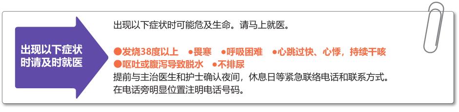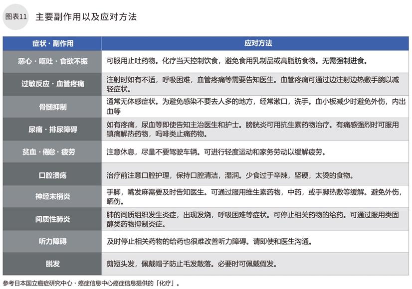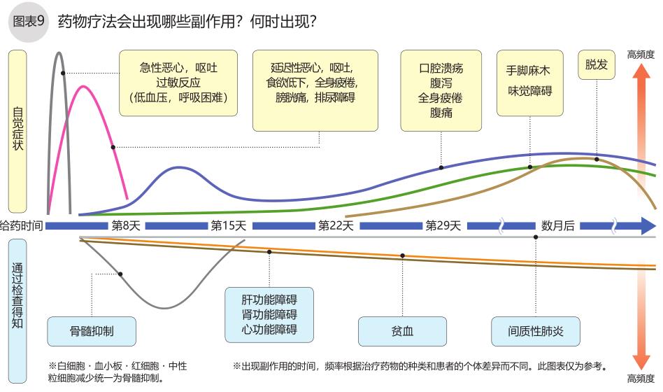 副作用的症状,强度以及发生时间,根据使用的药物种类和给药方式不同。分自觉症状,检查后得知症状两种,因个体化差异而不同。提前知晓主要的症状,出现的时间以及应对方法尤为重要(图表9,10)。