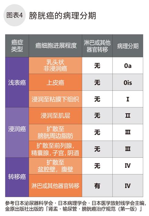 病理分期是根据肿瘤进展程度确定治疗方法的标准。膀胱癌的病理分期根据肿瘤的性状,在膀胱中的扩散程度,是否转移淋巴或其他器官等分为Oa期,Ois期,Ⅰ期、Ⅱ期、Ⅲ期、Ⅳ期六个阶段(图表4)。数字越大进展程度越广泛。Oa期和Ⅰ期为癌细胞尚未浸润肌层的浅表性癌。Ois期是上皮癌。Ⅱ期和Ⅲ期的癌细胞已经浸润肌层的浸润性癌。Ⅳ期则是癌细胞已经侵袭盆腔壁,腹壁,或已经扩散到淋巴及其他器官的转移癌。癌细胞的进展程度和恶性程度,可通过膀胱黏膜活检来判断。