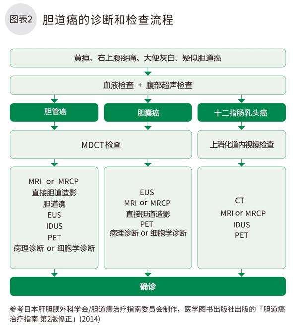 如果血液检查结果出现异常,腹部超声检查发现胆管或胆囊发生病变时,可先行MDCT(多排螺旋CT)影像检查确认肿瘤的扩散范围。十二指肠乳头部的病变,则需通过上消化道内视镜检查并采集病变组织后,进行病理诊断。