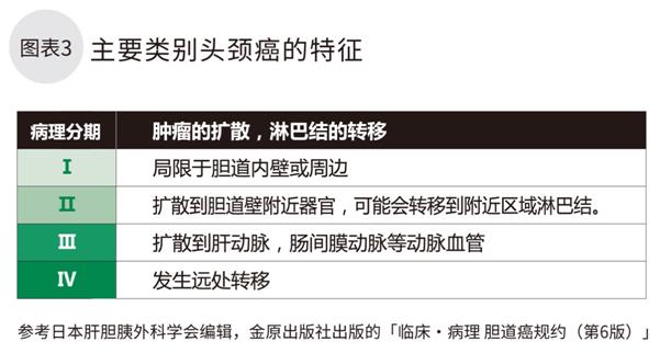 病理分期用来描述恶性肿瘤的严重程度,用来判断是否可以手术,手术可切除多大范围等,非常重要。胆道癌的病理分期,根据肿瘤的扩散程度(范围和深度),以及是否有淋巴,血管,周边器官的转移等大致分为Ⅰ~Ⅳ期的四个阶段(图表3)。