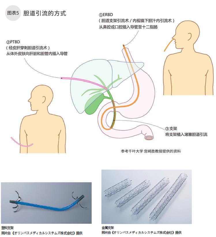 胆道癌Ⅳ期时由于发生转移,手术可能无法从转移的淋巴或器官中剥离肿瘤,此时的标准治疗为药物疗法。出现黄疸的,必须实施胆道引流(图表4)。