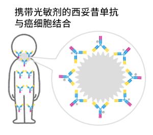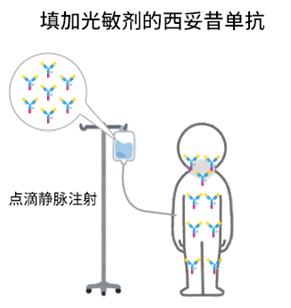 在与癌细胞表面特异蛋白结合的抗体中加入光敏剂后,静脉注射到体内。在该抗体和体内癌细胞结合后照射近红外线,将光束送达病变部位。光敏剂被近红外线照射后发生化学反应,破坏癌细胞。癌细胞会像气球一样一个一个爆破。要想破坏癌细胞,需要光敏剂和近红外线两者发生反应才行。没有光敏剂,或者不照射近红外线,都不会引起癌细胞的破损。而且,破损后癌细胞碎片可作为免疫细胞的抗原,可以增强免疫细胞对残留癌细胞攻击的能力,也会有治疗效果。