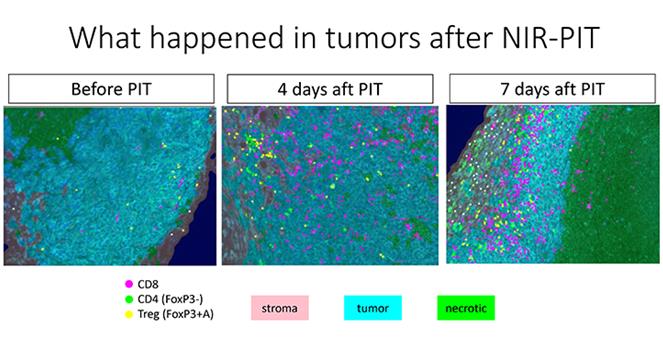 动物实验中,我们把肿瘤移植到4个不同部位。对其中最大的肿瘤组织进行近红外线照射后,4个肿瘤都消失了。这说明,在肿瘤的原发灶攻击癌细胞,如果能够获得有效的免疫状态,对远处转移灶也可能有效。如果可以生成一个淋巴细胞,能够仔细辨认癌细胞并进行攻击的话,便可能得到疫苗一样的全身性治疗效果。为了在体内生成有效的免疫状态,如前所述,可以考虑在光免疫疗法上结合免疫检查点抑制剂等治疗方案。