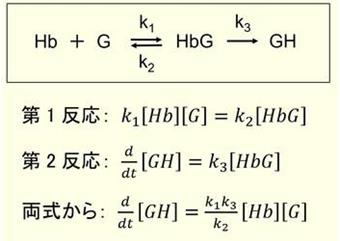 如果只考虑N端氨基与葡萄糖的结合,糖化血红蛋白的生成反应可以用图3简洁明了的表示。在第1反应中,血红蛋白和血糖反应生成醛亚胺。第二反应中,醛亚胺生成铜氨。在该图的反应式中,将aldimine(醛亚胺)用HbG,ketoamine(铜氨)用GH表示。GH与总血红蛋白的比率就是HbA1c。如果将每个反应的速度常数用k1、k2、k3表示,各种物质的血药浓度用[]显示的话,糖化血红蛋白的生成的方程式显示在图3的下方。t是时间,左边的微分方程式代表单位时间的生成率。