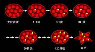 该过程用图4来表示。刚刚生成的红细胞中还没有糖化血红蛋白。此时,糖化血红蛋白数值为零. 通常,糖化血红蛋白以每天0.1%的速度生成,如果红细胞中有1000个血红蛋白分子,那每天就生成1个糖化血红蛋白。也就是说,年龄为1天的红细胞中存在1个糖化血红蛋白。第2天就会有2个糖化血红蛋白。随着时间的推移,糖化血红蛋白逐渐生成,并储备在红细胞中。等到了120天时,红细胞中将有120个糖化血红蛋白。此时红细胞寿命将耗尽,糖化血红蛋白被清除。