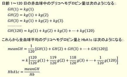 跟之前一样,假设红细胞的年龄为1-120天之间的整数,并且年龄分布恒定。过去血糖每天变化,假设一天中的变化是恒定的。1天前,2天前,3天前・・・120天前的血糖用g(1)、g(2)、g(3)・・・g(120)来表示。那么,每个年龄段的红细胞中糖化血红蛋白的量为GH(1)、GH(2)、GH(3)・・・GH(120),如图7的上半部分所示。HbA1c测定前的第n天到HbA1c测定的前一天为止产生的糖化血红蛋白积存在年龄n天的红细胞中。所有红细胞中的平均糖化血红蛋白量用meanGH来表示的话,那就是GH(1)~GH(120)。结果显示在图7的下半部分。meanGH除以总血红蛋白量Hb,就能计算HbA1c。因为血糖每天变化,g(1)~g(120)的系数就是过去血糖对HbA1c的贡献率。这和血糖值恒定时是完全相同的。因此,最近的血糖对HbA1c的贡献率大,过去的血糖贡献率越小。