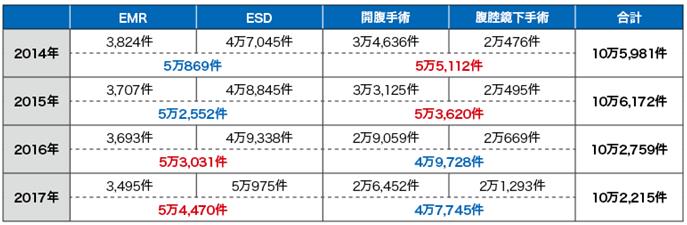 根据厚生劳动省的国家数据库(NDB)公开的数据,自2016年以来,实施内窥镜治疗次数已超过外科手术治疗的次数; 2017年内窥镜手术54,470例(EMR 3,495例,ESD 57975例), 外科手术47,745例(开腹手术26,452例,腹腔镜手术21,293例)(表1)。小野先生说:“我们期待最新结果的统计数据。晚期癌症数量可能会下降。”