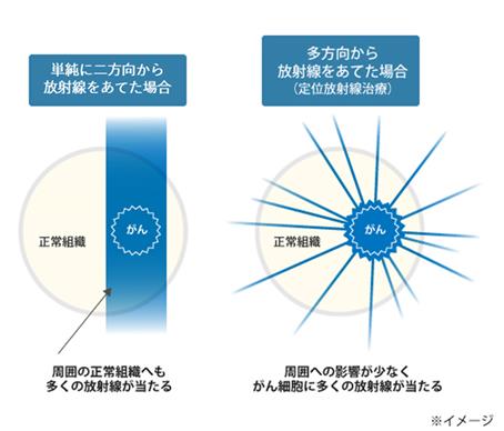从各个角度向癌症病灶照射微弱射线的治疗方法也逐渐开始普及。每条射线的能量很微弱,对正常组织的损害也较小,但是如果从四面八方一起集中照射射线的话,将对癌症病灶产生强大的摧毁能力。