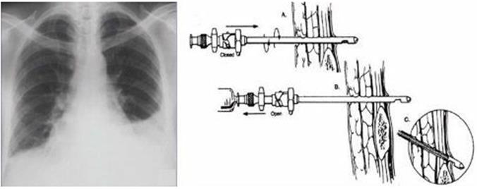 胸膜活检术: 在给予患者局部麻醉后,将一支经特殊专业设计的胸膜活检器械穿刺插入胸膜腔,钩取壁层胸膜组织,送病理学切片检查。患者在接受胸膜活检术时会有一些局部酸胀不适,只要患者配合良好,一般很少有较严重的并发症。