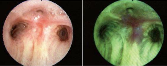 荧光下(右)发现了普通光下(左)难以发现的黏膜下病灶