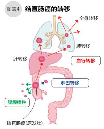 结直肠癌的肿瘤向大肠壁深处侵袭时,癌细胞将会散落流入大肠壁中的淋巴管和血管中,这种向其他部位的“星火燎原”被称为“转移”,在转移处癌细胞“落户生根”的称为“转移灶”。目前普遍认为结直肠癌的转移有3个路径:淋巴、血液、播种(图4)
