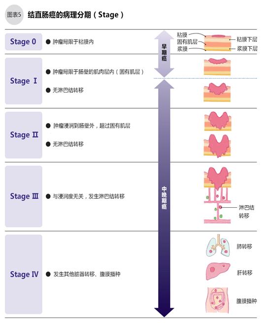 根据肿瘤的进展程度,肿瘤的深度、淋巴结的转移程度、有无其他脏器转移等具体情况将结直肠癌分为5期(Stage)。在进行治疗前,应该先确定病理分期