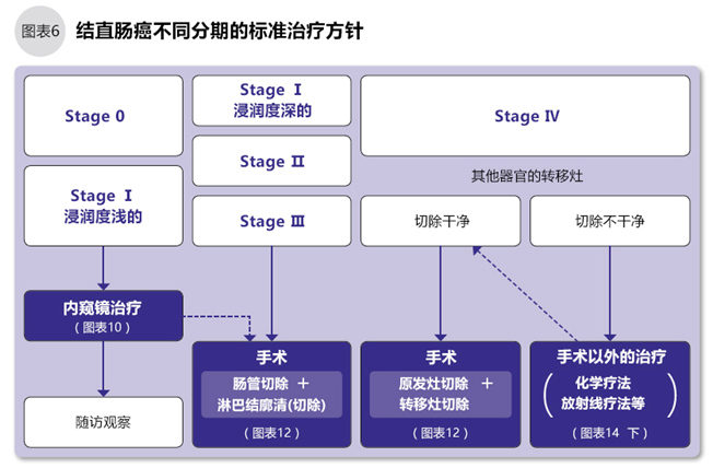 分期为StageⅠ的结直肠癌,癌细胞浅度浸润肠壁的,可用和Stage0相同的内窥镜切除;癌细胞深度浸润肠壁的,为了避免不完全切除和防范淋巴结转移,须手术切除部分肠管和可能转移的淋巴结(图12)。