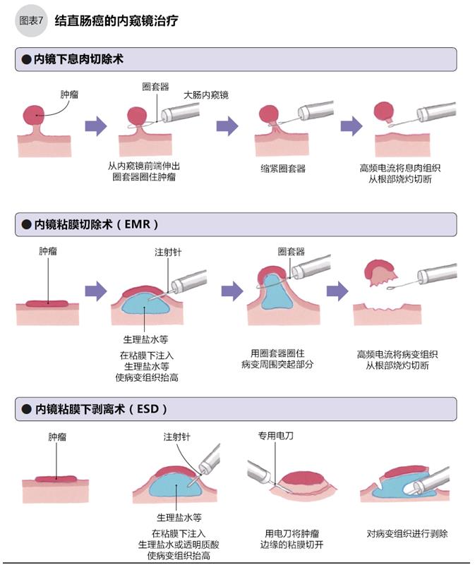 内窥镜治疗的过程比较简单:从肛门将内窥镜插入大肠,前端小孔伸出工具切除肿瘤。根据肿瘤的特点,有3种切除方法:肿瘤呈根茎状的采取息肉切除术,肿瘤呈扁平状的采取内镜粘膜切除术(EMR)或内镜粘膜下剥离术(ESD)。如图7。ESD是使用内窥镜电刀切除肿瘤及周围组织的新技术,在日本使用交广,与EMR相比,ESD能一次性切除更大的肿瘤,但其对医生的技能要求更高。