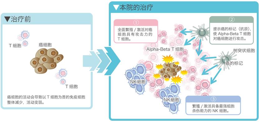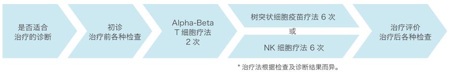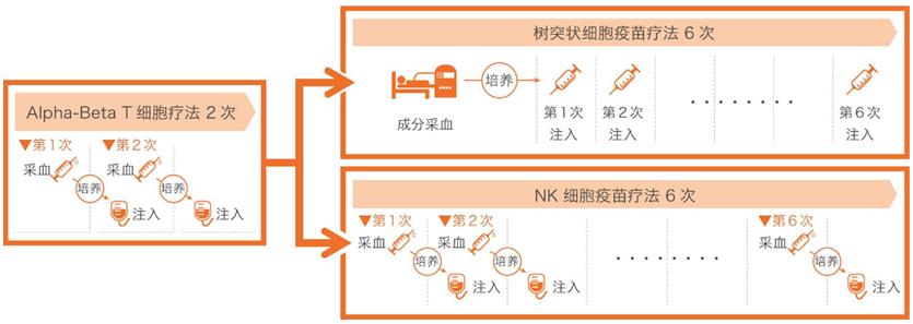 初诊来院后约2周后开始正式进入治疗阶段。首先是全面恢复患者的免疫功能,通过实施2次 Alpha-Beta T细胞疗法,使患者免疫系统达到可与癌症抗争的状态。之后根据检查结果,选择树突状细胞疫苗疗法或NK细胞疗法并实施6次治 疗。治疗总次数为8次,每种疗法都需进行治疗前的采血和2周时间培养免疫细胞、之后通过输液或注射方式注入患者体内。